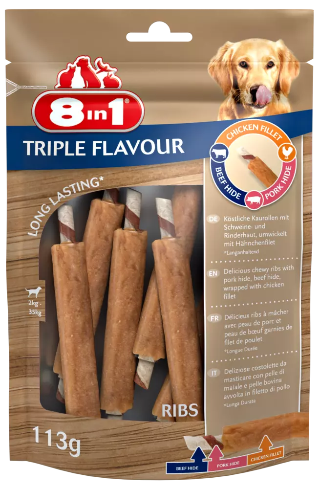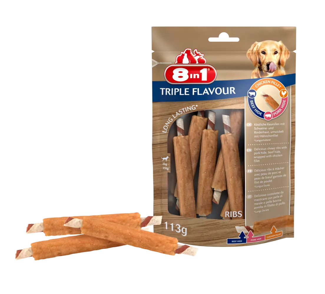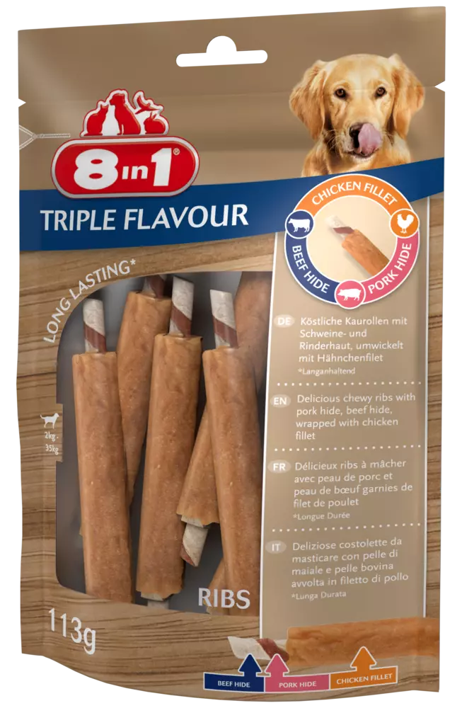 Żeberka zapewniające psu długotrwałe żucie pomagają kontrolować odkładanie się kamienia nazębnego i płytki nazębnej dzięki ich naturalnemu działaniu ściernemu podczas żucia. Są bogate w białko, mają niską zawartość tłuszczu i nie zawierają cukru, wzmacniaczy smaku ani sztucznych konserwantów, dzięki czemu są idealną nagrodą lub przekąską dla psów każdej wielkości. Ponadto nie zawierają GMO i są wypiekane w piecu, co nie tylko przedłuża ich trwałość, ale także pozwala zachować cenne składniki odżywcze. Zapewnij swojemu psu przyjemną rozrywkę i zajmij go żeberkami 8in1 Triple Flavour.