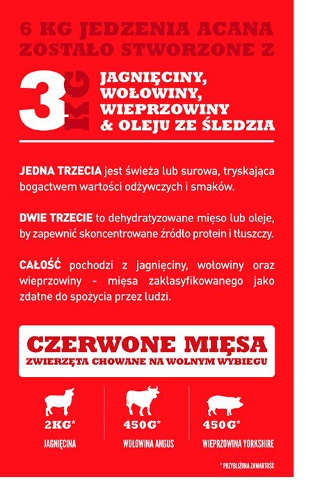 1/3 mięsa w jedzeniu ACANA jest ŚWIEŻA, dostarczając niezbędnych składników w najbardziej odżywczej formie, a 2/3 to mięso dehydratyzowane, aby zapewnić bogate źródło białka mięsnego.