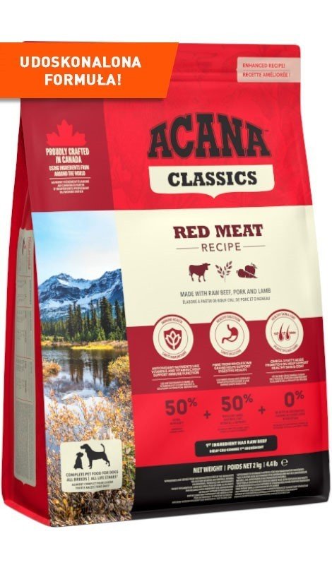 Całkowicie wolna od glutenu, ACANA CLASSICS Classic Red jest w 50% przepełniona mięsem – to prawie dwukrotność tego, co zawiera większość specjalistycznych karm dla psów.