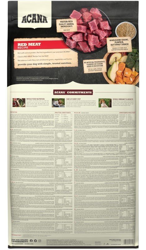 Bogata w mięso w proporcjach WholePrey™ ACANA CLASSICS Classic Red dostarcza Twojemu psu składników odżywczych w naturalny sposób, ograniczając suplementację do witamin A, B5, D3 i E, choliny i cynku. Wszystko, czego potrzebuje Twój pies, pochodzi z naszych składników.
