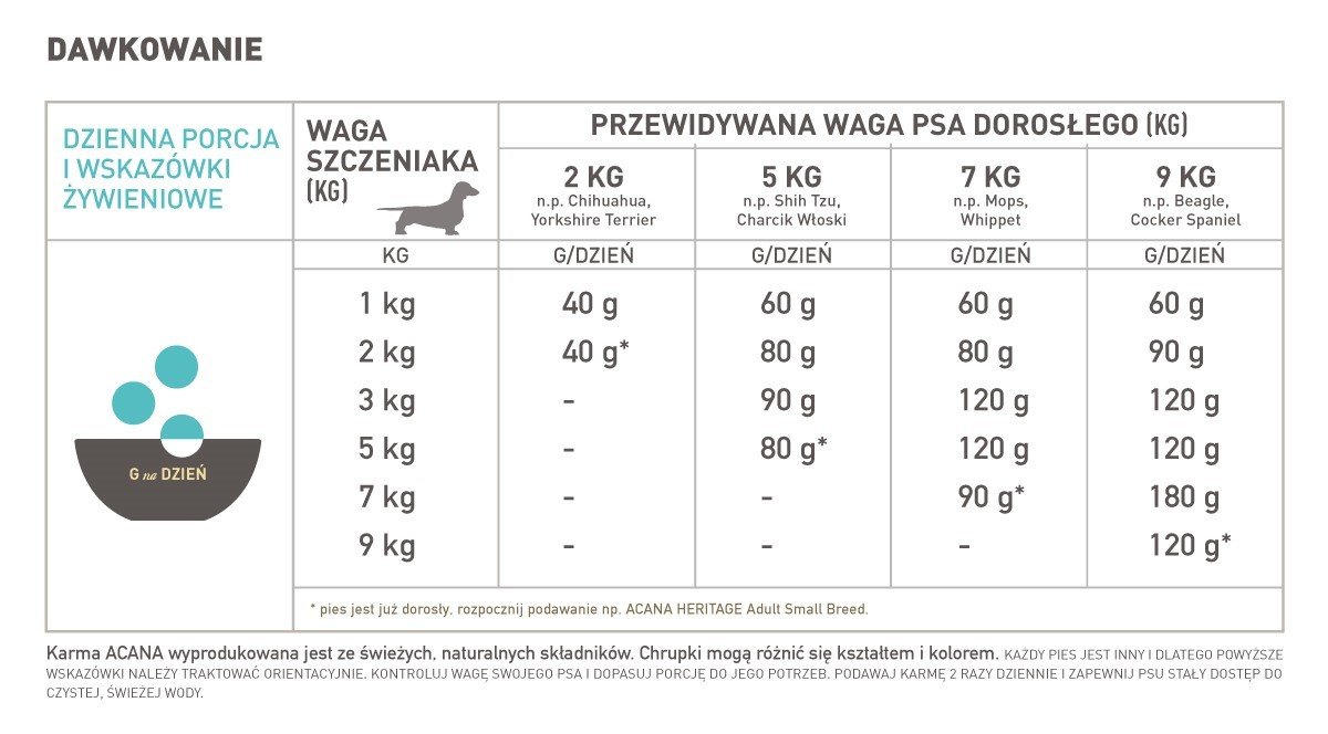 Formuła jedzenia ACANA Puppy Small Breed odpowiada wymogom żywieniowym ustalonym przez AAFCO – profile żywieniowe dla psów we wszystkich stadiach życia.