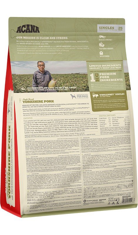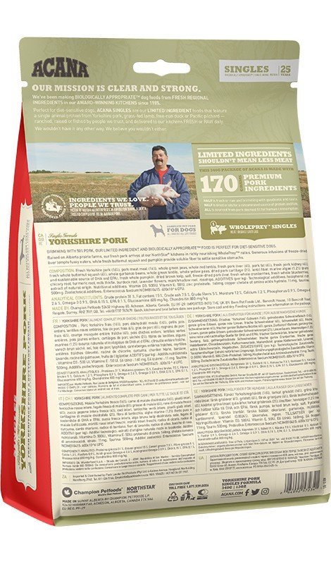 Jedzenie ACANA SINGLES Yorkshire Pork zawiera niezrównaną różnorodność mięsnych składników, dostarczanych przez ludzi, których znamy i którym ufamy. Zaklasyfikowane są jako zdatne do spożycia przez ludzi i dostarczane do naszej wielokrotnie nagradzanej kuchni NorthStar® świeże każdego dnia.