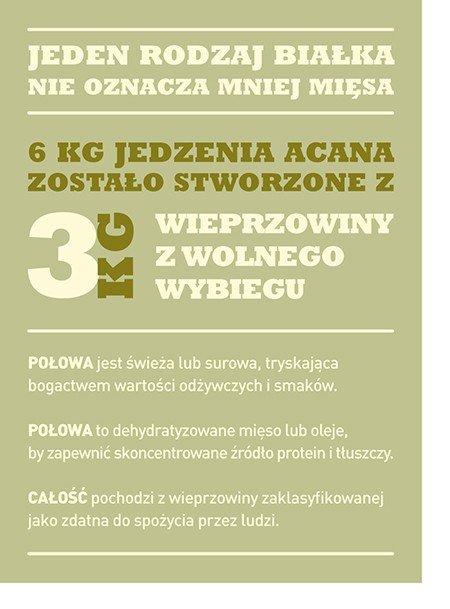 1/2 mięsa w jedzeniu ACANA jest świeża, dostarczając niezbędnych składników w najbardziej odżywczej formie, 1/2 to mięso dehydratyzowane, aby zapewnić bogate źródło białka mięsnego.