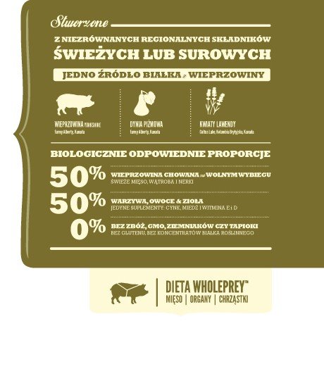 Świeża wieprzowina yorkshire (16%), dehydratyzowana wieprzowina (16%), cały groch zielony, cała czerwona soczewica, świeża wątroba wieprzowa (6%), tłuszcz wieprzowy (6%), świeże nerki wieprzowe (4%), świeża cała dynia piżmowa (4%), cała ciecierzyca, cała zielona soczewica, cały groch żółty, dehydratyzowane chrząstki wieprzowe (2%), włókno soczewicy, algi morskie (1.2%) (źródło DHA i EPA), świeża cała dynia, suszony brązowy kelp, sól, liofilizowana wątroba wieprzowa (0.1%), świeża cała żurawina, świeże całe borówki, korzeń cykorii, kurkuma, ostropest plamisty, korzeń łopianu, kwiat lawendy, korzeń prawoślazu lekarskiego, owoce dzikiej róży.