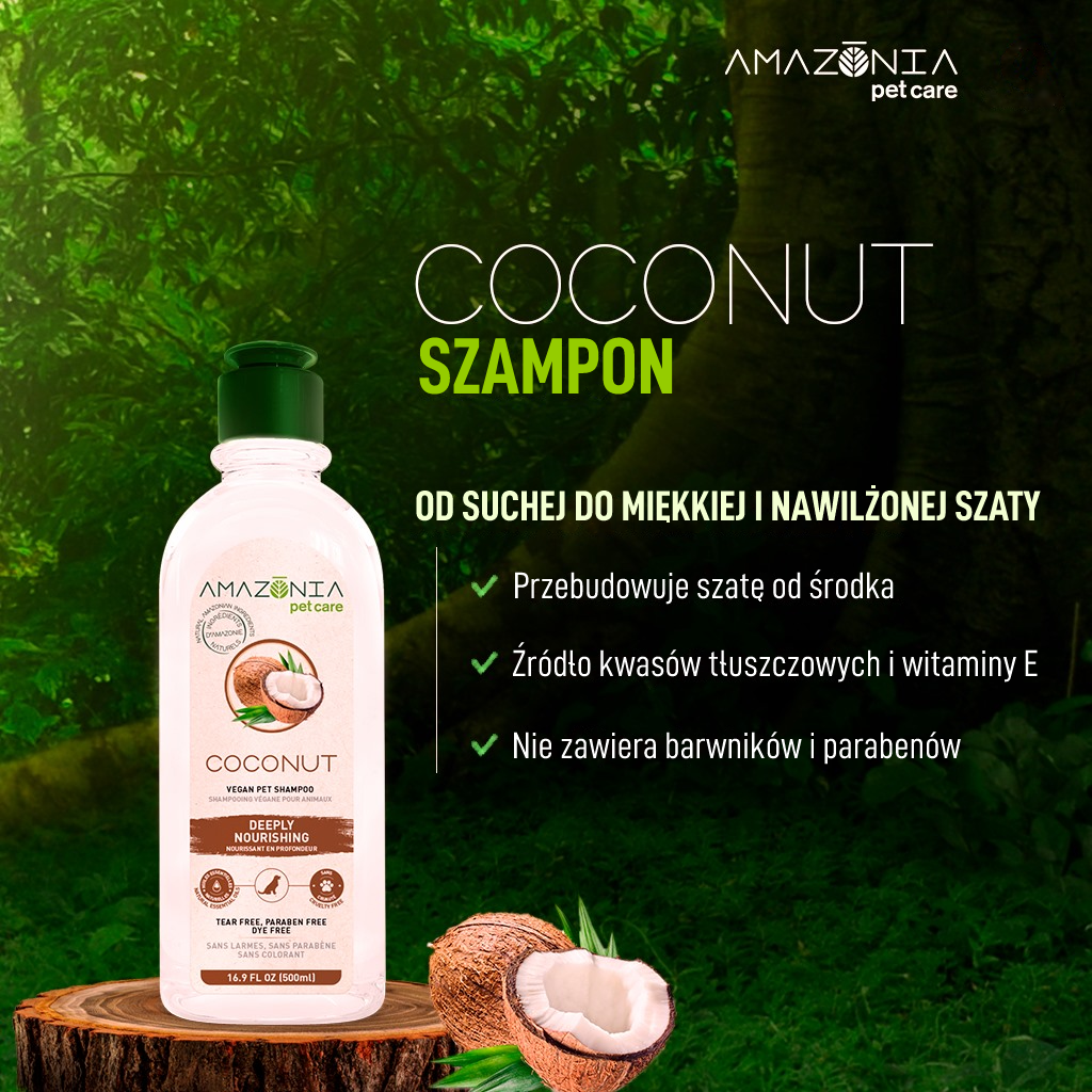 Spraw, aby szata Twojego psa z twardej i suchej stała się miękka i całkowicie nawilżona dzięki mocy kokosa z Lasu Amazońskiego.