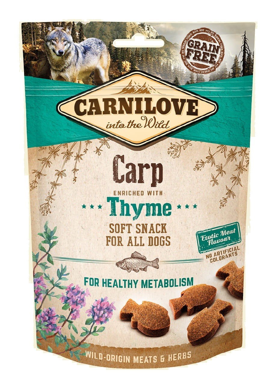 SKŁAD: 35% suszony karp, żółty groszek, płynna skrobia warzywna, sos z łososia, sos z wątróbki drobiowej, kolagen, 1% tymianek, olej z łososia.