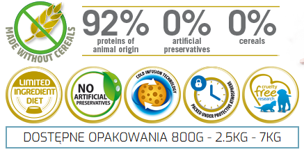 Zastosowanie: formuła dla zwierząt z nietolerancją pokarmową objawiającą się problemami skórnymi, zawierająca aż 92% białek pochodzenia zwierzęcego.