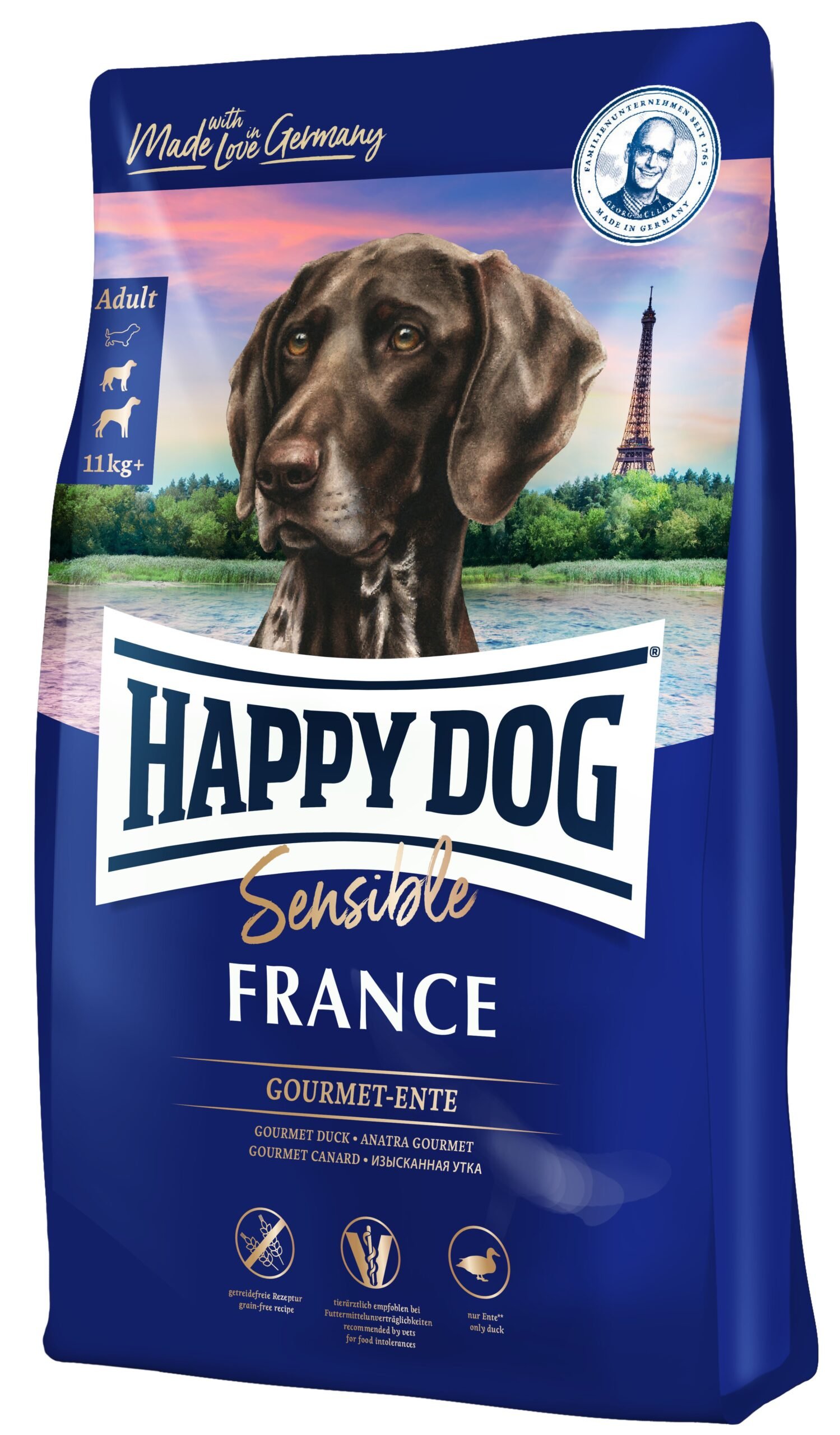 Happy Dog Sensible France opiera się na kompleksowej kompozycji ze smacznej kaczka i wybornych ziemniaków. Zbilansowana receptura zapewni Państwa czworonogowi wszystko to, czego potrzebuje. Pyszna kaczka dostarcza ważnych białek zwierzęcych – w 100% dostosowanych do potrzeb Państwa psa. Delikatne ziemniaki dostarczają Państwa pupilowi wystarczającej energii do zabawy i szaleństw. Wartościowe niezbędne kwasy tłuszczowe omega-3 i omega-6 zapewniają piękną, błyszczącą sierść. Karma sucha Sensible France to zdrowe i pełnowartościowe, a zarazem proste żywienie. Wystarczy otworzyć pojemnik, napełnić miskę i gotowe – pies może ucztować.