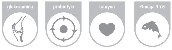 Białko 23,0 %; Tłuszcz 10,0 %; Włókna 2,5 %; Popiół 6,5 %; Wilgotność 10 %; Fosfor 1,0 %; Wapń 1,5 %, Glukozamina 100 mg/kg, Chondroityna 100 mg/kg.