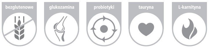 Białko 23,0 %; Tłuszcz 13,0 %; Włókna 2,0 %; Popiół 7,0 %; Wilgotność 8,0 %; Fosfor 1,0 %; Wapń 1,4 %, Glukozamina 100 mg/kg, Chondroityna 100 mg/kg.