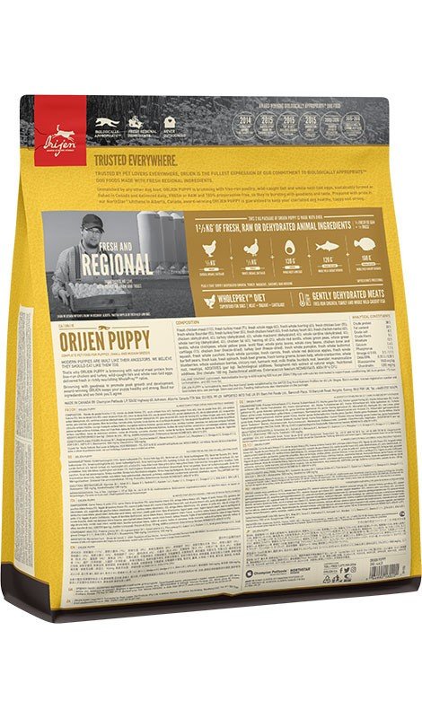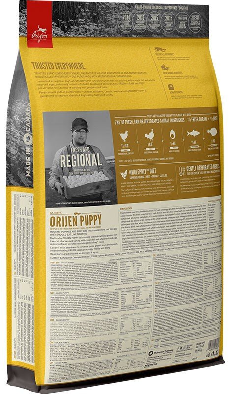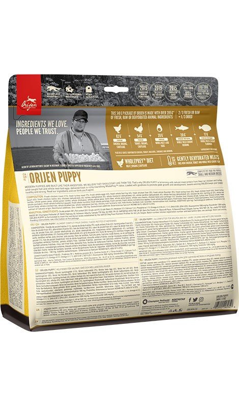 Dlatego w składzie karmy ORIJEN nie znajdziecie długiej listy syntetycznych dodatków. Jest za to przepełniony odżywczymi proporcjami świeżego drobiu, organów, chrząstek, całych ryb oraz jaj, dzięki czemu dostarcza naturalnego źródła prawie wszystkich składników odżywczych niezbędnych dla szczeniąt.