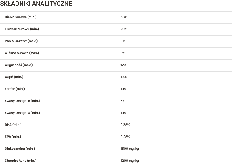 Skład: świeże mięso kurczaka (11%), świeże mięso indyka (7%), świeże całe jaja (6%), świeży cały śledź (6%), świeża wątroba kurczaka (5%), świeża cała flądra (5%), świeża wątroba indyka (5%), świeże serce kurczaka (4%), świeże serce indyka (4%), świeża szyja kurczaka (4%), kurczak (dehydratyzowany, 4%), indyk (dehydratyzowany, 4%), cała makrela (dehydratyzowana, 4%), całe sardynki (dehydratyzowane, 4%), cały śledź (dehydratyzowany, 4%), tłuszcz z kurczaka (4%), olej ze śledzia (2%), cała czerwona soczewica, cały groch zielony, cała zielona soczewica, cała ciecierzyca, cały groch żółty, włókno soczewicy, cała fasola pinto, cała fasola biała, chrząstki kurczaka (1%), wątroba kurczaka (liofilizowana), wątroba indyka (liofilizowana), świeża cała dynia, świeża cała dynia piżmowa, świeża cała cukinia, świeży cały pasternak, świeża marchew, świeże całe jabłka red delicious, świeże całe gruszki bartlett, świeży jarmuż, świeży szpinak, świeże liście buraków, świeże liście rzepy, brązowy kelp, cała żurawina, całe borówki, całe jagody saskatoon, korzeń cykorii, kurkuma, ostropest plamisty, korzeń łopianu, kwiat lawendy, korzeń prawoślazu lekarskiego, owoce dzikiej róży. DODATKI (na kg): Cynk: 100 mg. Dodatki zootechniczne: Enterococcus faecium NCIMB10415: 600×10^6 CFU.