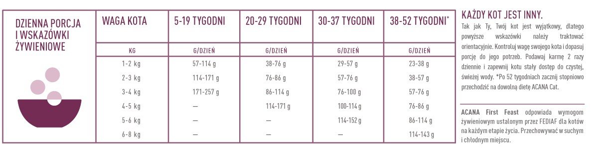 Rozkład kalorii i energia metaboliczna w karmie Acana First Feast: