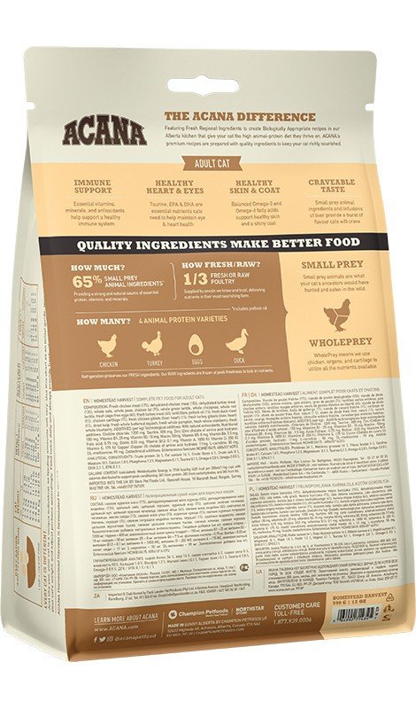 Dodatki żywieniowe karmy Acana Homestead Harvest dla dorosłych kotów: