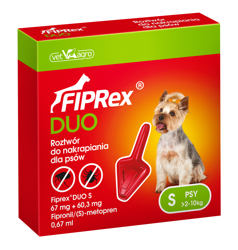 Fiprex® Duo to nowa linia produktów leczniczych przeznaczona do zwalczania inwazji kleszczy, pcheł oraz wszołów u psów, kotów i fretek. Fiprex® Duo zawiera w składzie dwie substancje czynne: Fipronil oraz (S)-Metopren. Działanie preparatu polega na eliminowaniu pcheł, kleszczy oraz wszołów, poprzez blokowanie przewodnictwa nerwowego pasożyta, a w konsekwencji jego paraliż i obumarcie. Fipronil zwalcza pchły w ciągu 24 godzin, a kleszcze i wszoły w ciągu 48 godzin od zastosowania. Zawarty w Fiprexie ® Duo (S) –Metopren – hamuje rozwój niedojrzałych postaci pcheł ( jaja, larwy i poczwarki), które występują w środowisku bytowania zwierząt, min. w kojcach i legowiskach.