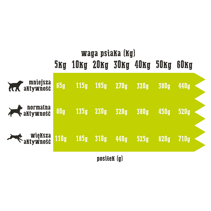 Tabelę dawkowania znajdziesz w zdjęciach produktu. Podane w tabeli wielkości posiłku są orientacyjne. Obserwuj swojego czworonoga i zmniejsz lub zwiększ wielkość posiłku w razie potrzeby.